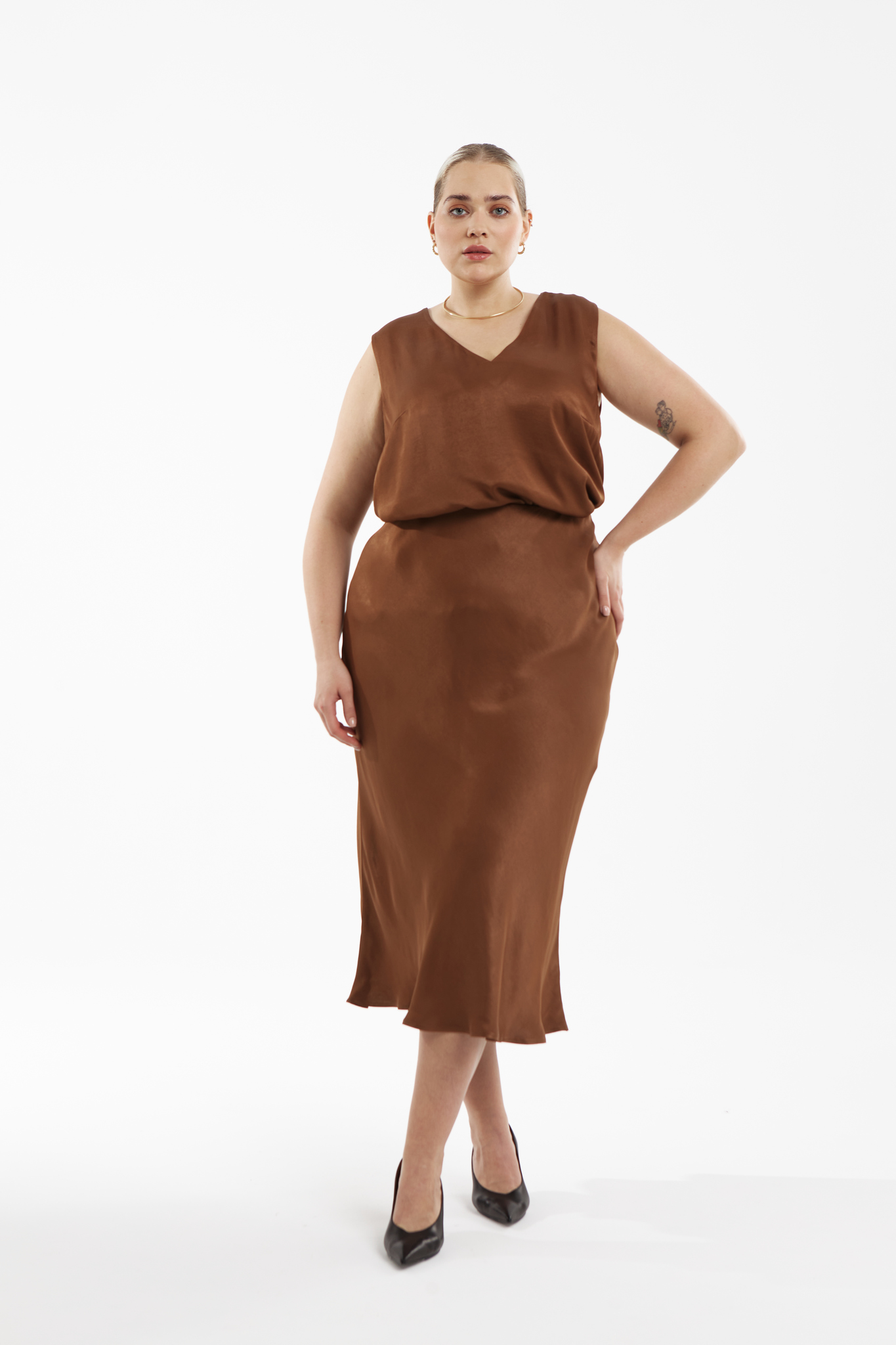 Для того, чтобы создать струящиеся топы с V-образным вырезом, широкими бретелями и чуть расклешенным фасоном, мы выбрали 100% вискозу греческого производства. Ткань невероятно красиво переливается и будто сияет изнутри. Составляет пару с юбкой из вискозы в тон, топ можно носить как заправленным, так и навыпуск. Только химчистка.