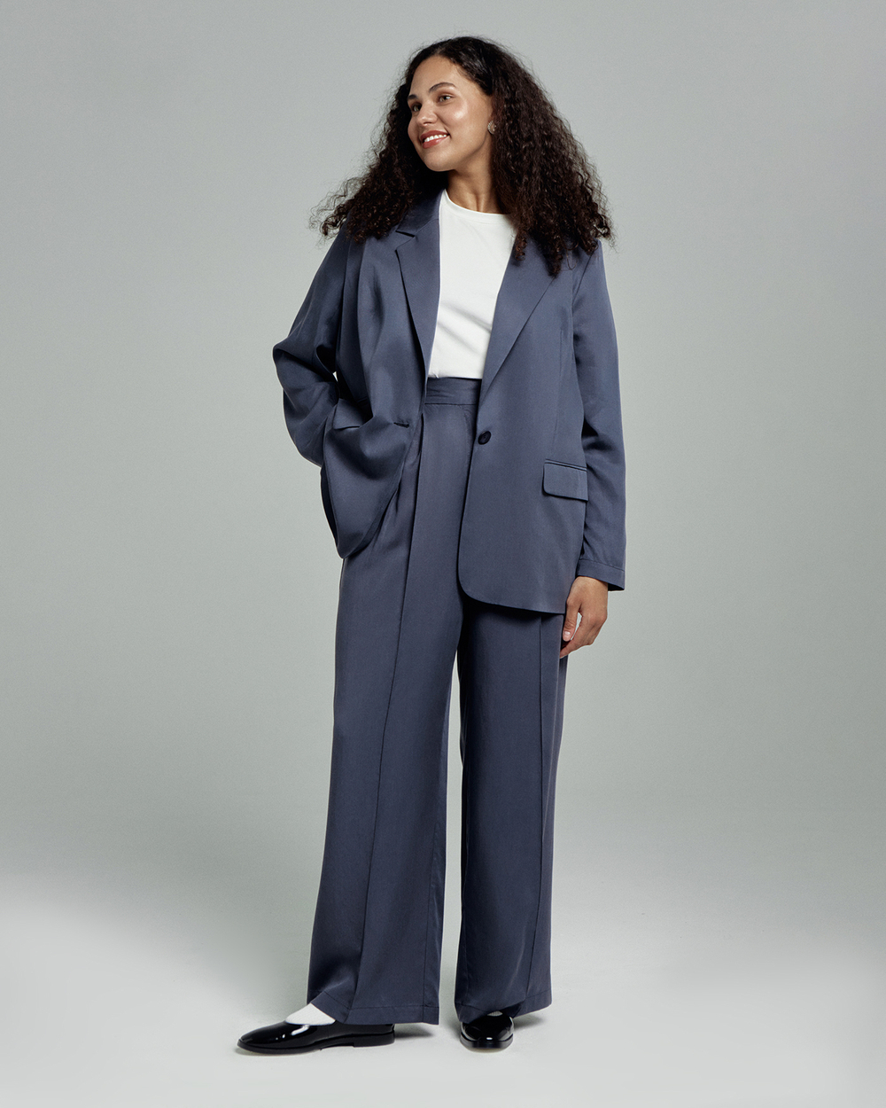 Свободные брюки-палаццо из купры прекрасно смотрятся не только комплектом с жакетом, но и соло с любым верхом. Материал выглядит изумительно: бархатистый, сияющий и, самое главное, дышащий и комфортный. Такие прекрасно подойдут для летнего расслабленного образа. Свободный крой, эластичный пояс на резинке с пуговицей и шлевками под ремень и стрелки, визуально удлиняющие силуэт. В офис стилизуем с рубашкой и жакетом, а на прогулку с расслабленной футболкой.