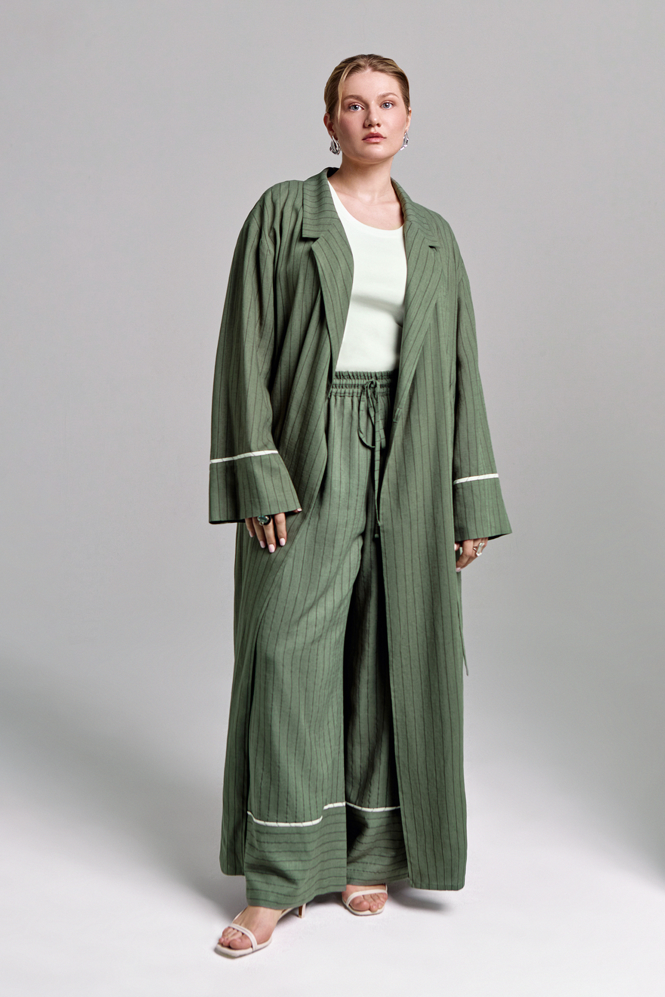 Расслабленные летние брюки на резинке. Изделие выполнено из смеси вискозы и льна, что позволит чувствовать себя комфортно в теплую погоду. Брюки выполнены в спокойных природных оттенках и дополнена декоративными полосами и манжетами. Изделие дополнено завязками и поясом на резинке, что позволит подстроить его под фигуру. Сочетайте брюки с рубашкой-кимоно или платьем-накидкой из комплекта.