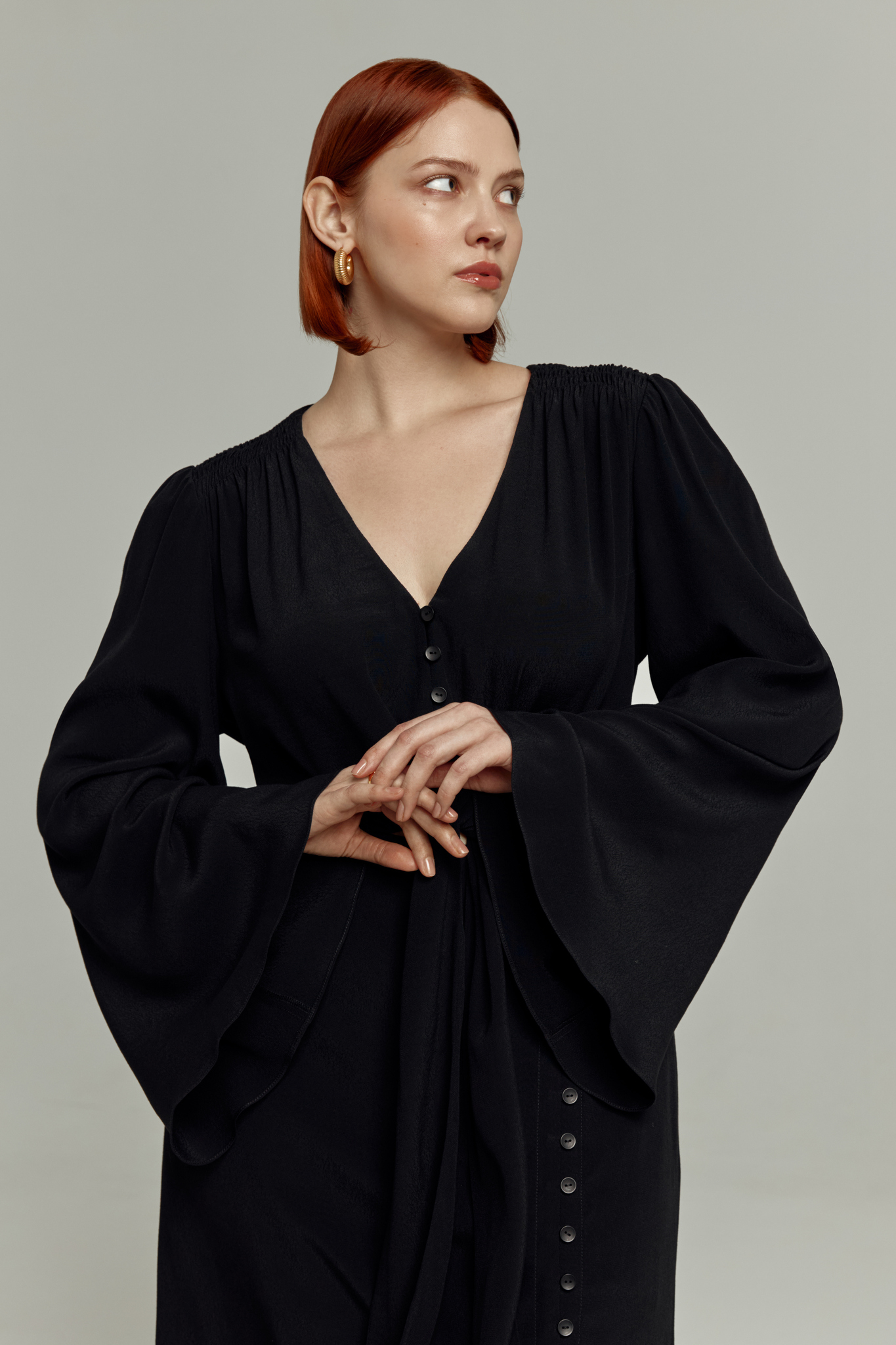 Струящаяся юбка макси с элегантным боковым разрезом и пуговицами позволяет регулировать глубину разреза в зависимости от настроения или повода. Легкая и женственная юбка сочетается с комплектной блузой или базовыми майками, рубашками и пиджаками.