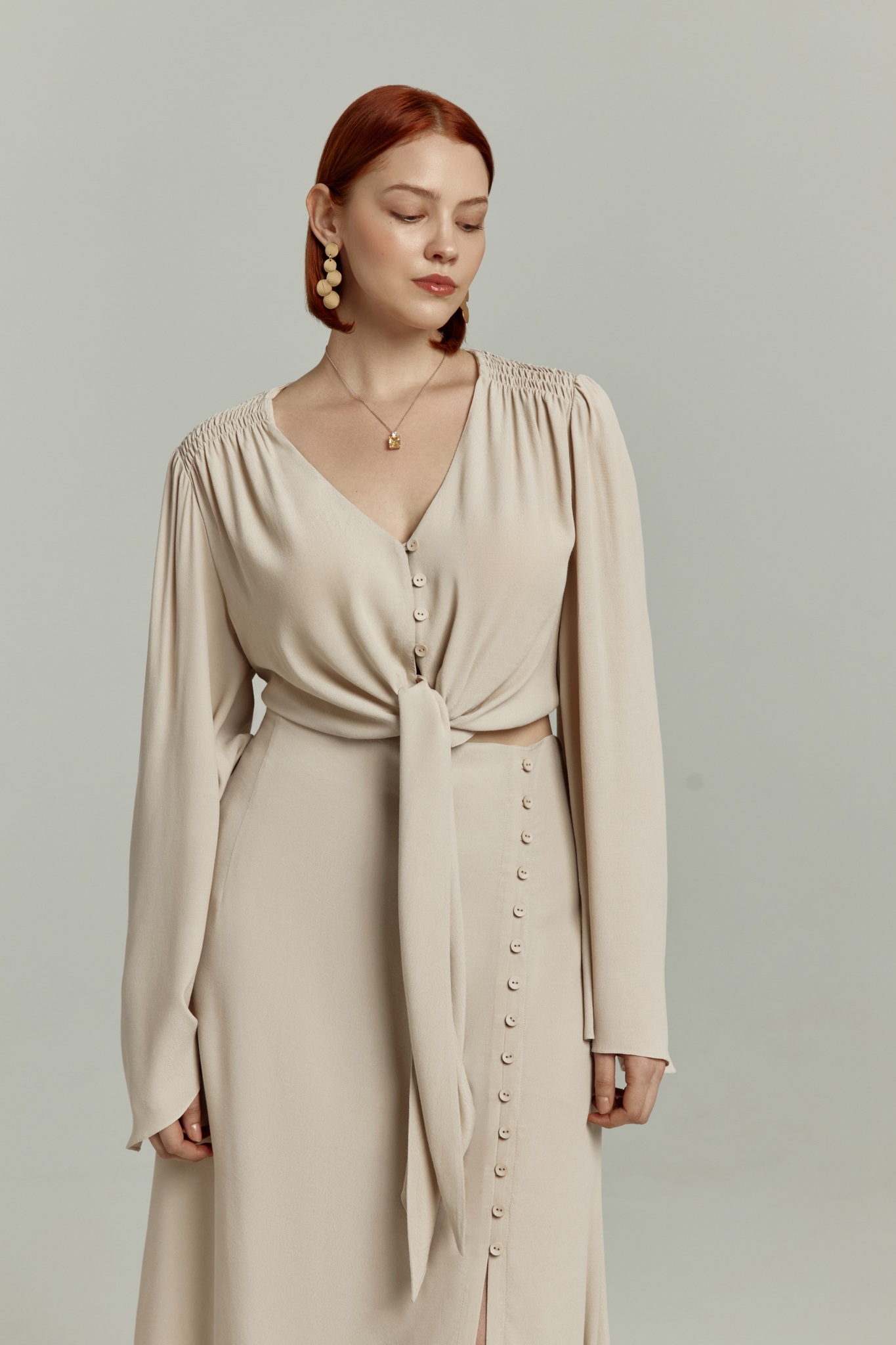 Струящаяся юбка макси с элегантным боковым разрезом и пуговицами позволяет регулировать глубину разреза в зависимости от настроения или повода. Легкая и женственная юбка сочетается с комплектной блузой или базовыми майками, рубашками и пиджаками.