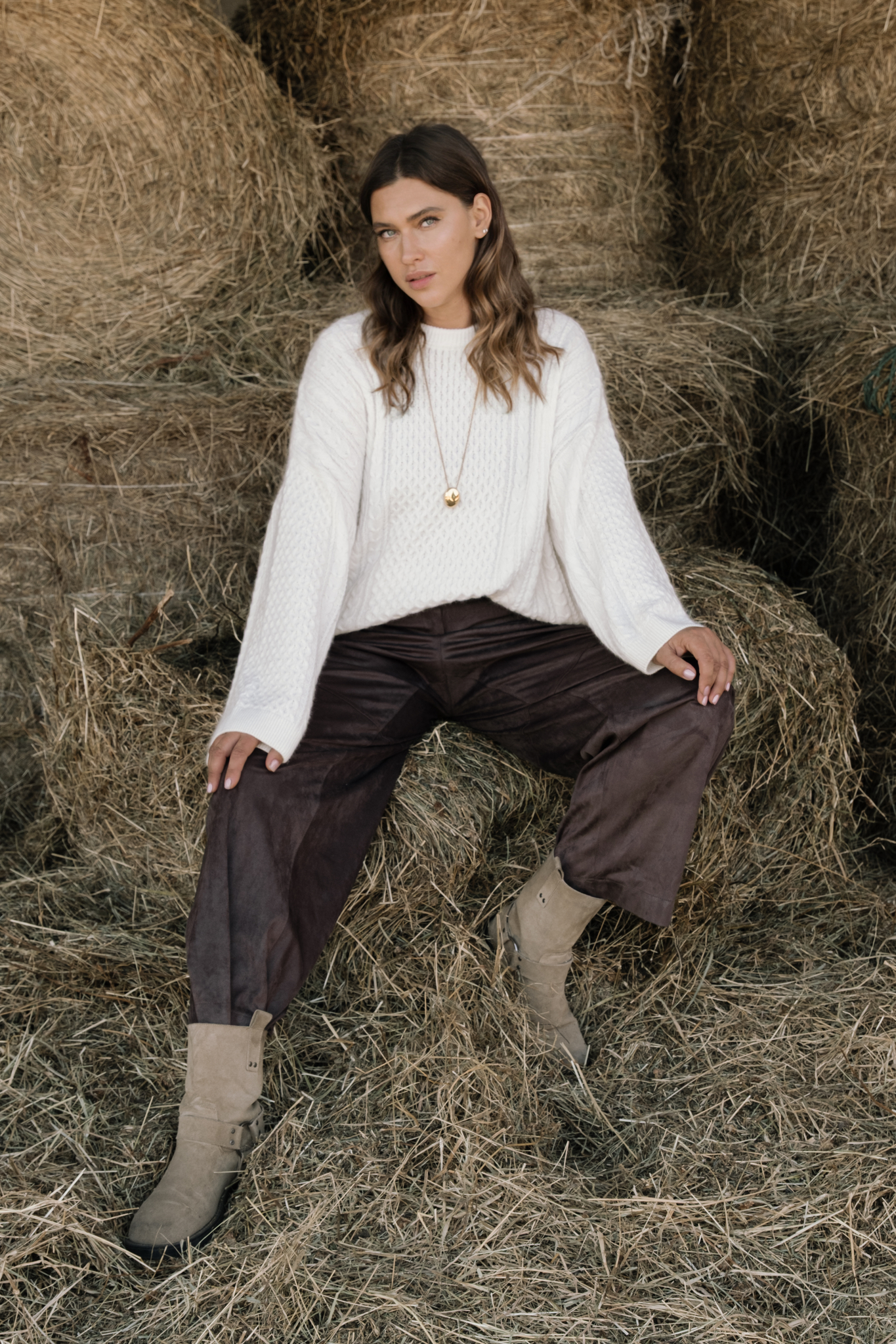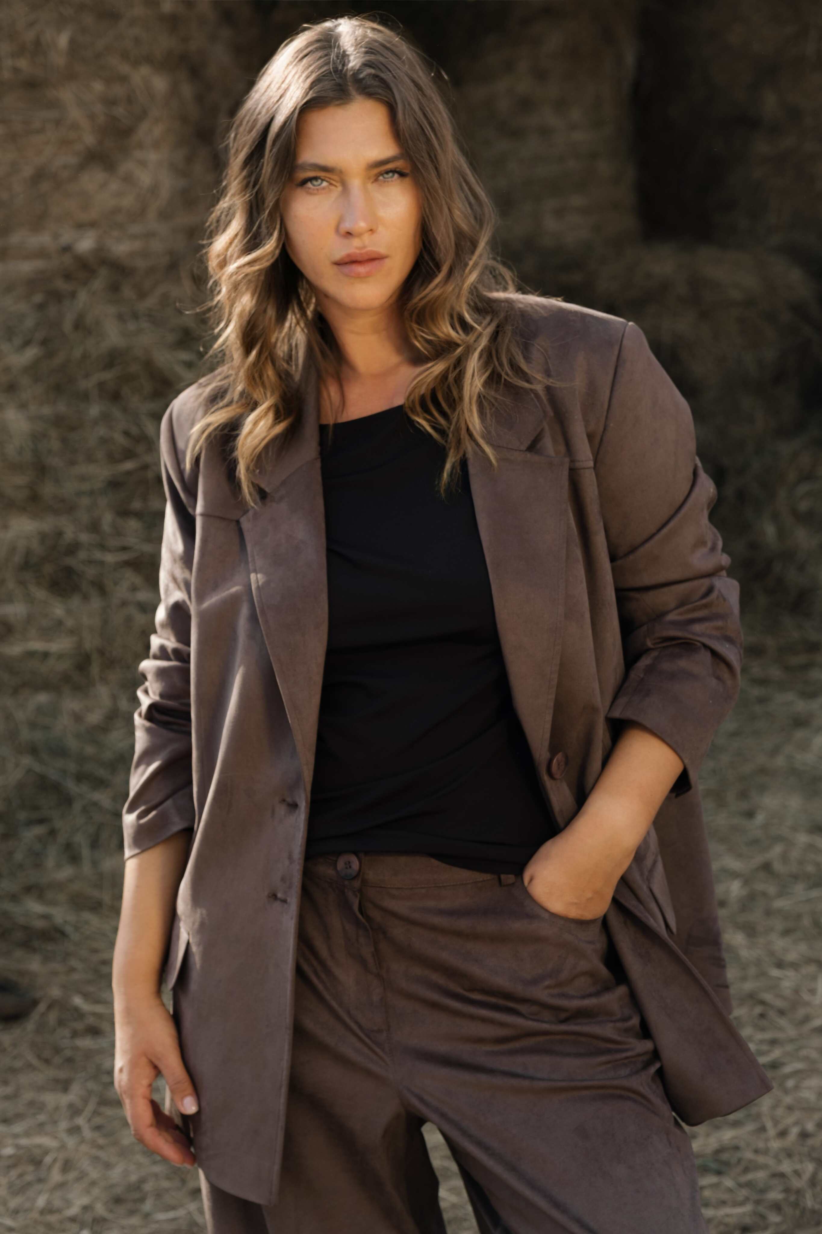 Юбка из мягкой замши с декоративными резами, которые удлиняют ноги. Приятная на ощупь, она дарит комфорт и уверенность в себе. Сочетайте с жакетом из того же комплекта для гармоничного монохромного образа или создавайте контрасты с другими вещами, добавляя образу характер и настроение.