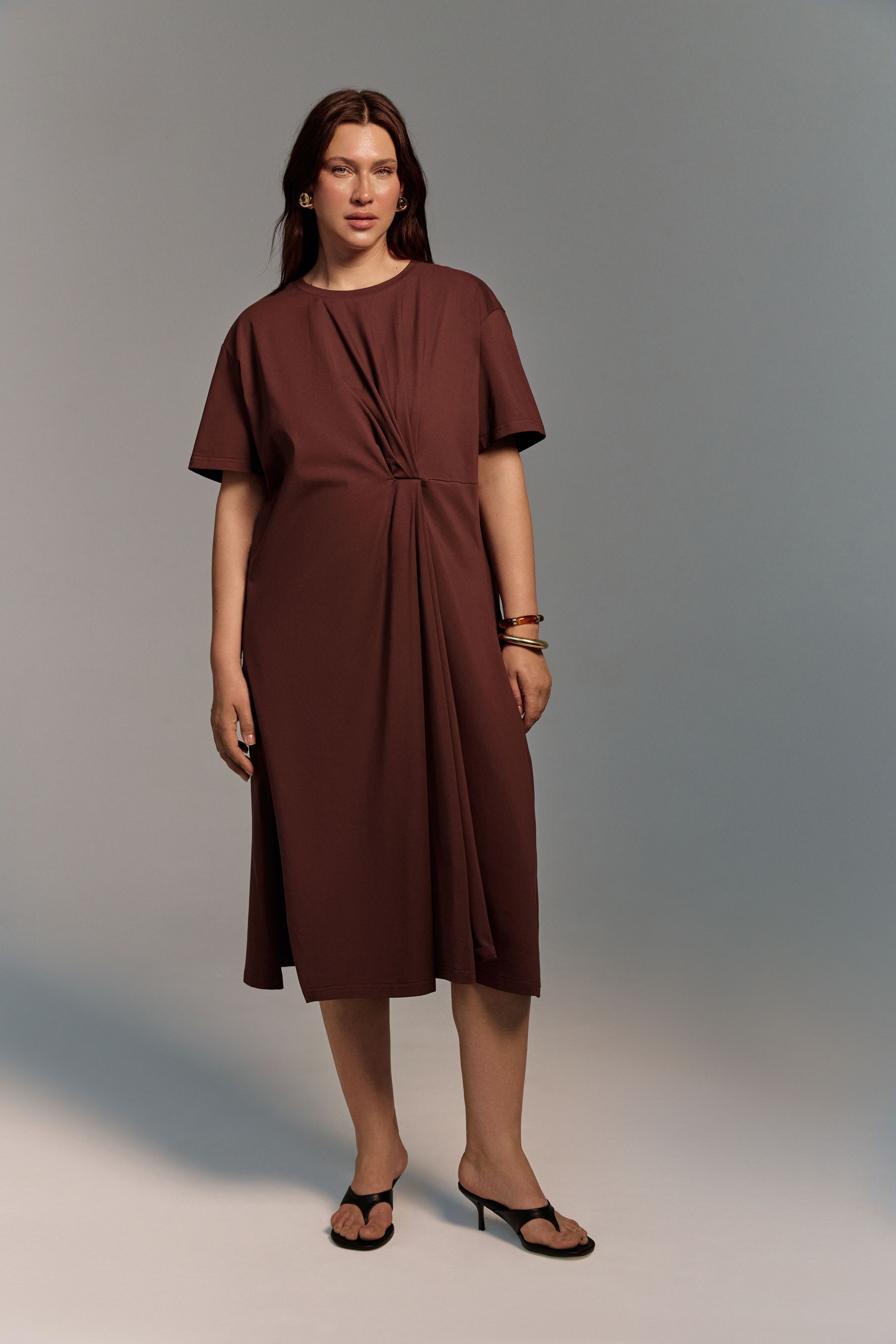 Боковая драпировка напоминает движение ветра и создает динамику силуэта. Разрез добавляет асимметрию и легкую дерзость, балансируя образ.